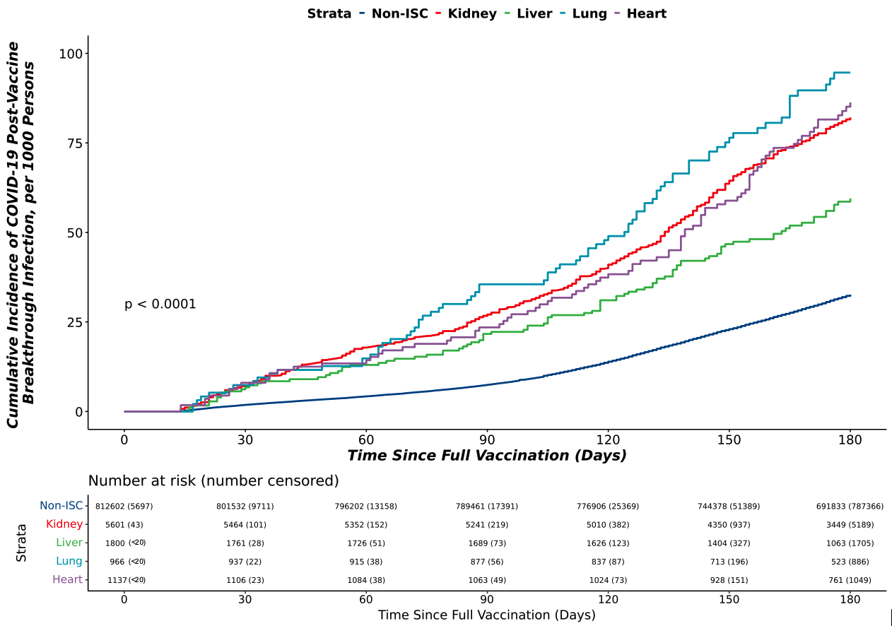 Methods: In a cohort of adult patients testing positive for COVID-19 prior to the Omicron wave (12/10/2020-12/18/2021), we used data from 37 sites across the United States using the National COVID Cohort Collaborative (N3C) to examine the efficacy of 2 doses of mRNA vaccination or 1 dose of Johnson & Johnson (VAX2) in a non-immunocompromised/immunosuppressed (ISC) population compared to SOT recipients. The cumulative incidence of breakthrough COVID-19 (BTCo) in the 6 months post VAX2 in the non-ISC population and in the SOT cohort by organ type (kidney, liver, lung, or heart) was demonstrated using cumulative incidence curves per 1000 persons. We assessed the risk of complications (major adverse renal or cardiac events (MARCE), major adverse cardiac events (MACE), acute kidney injury (AKI), mortality, hospitalization, or a composite of requiring ECMO, ventilation, or dying) in the 90-days post BTCo in VAX2 SOT recipients versus SOT with unconfirmed vaccination status (UVS) using multivariable Cox proportional hazards and logistic regression as required. This analysis was repeated in the non-ISC population for comparison.