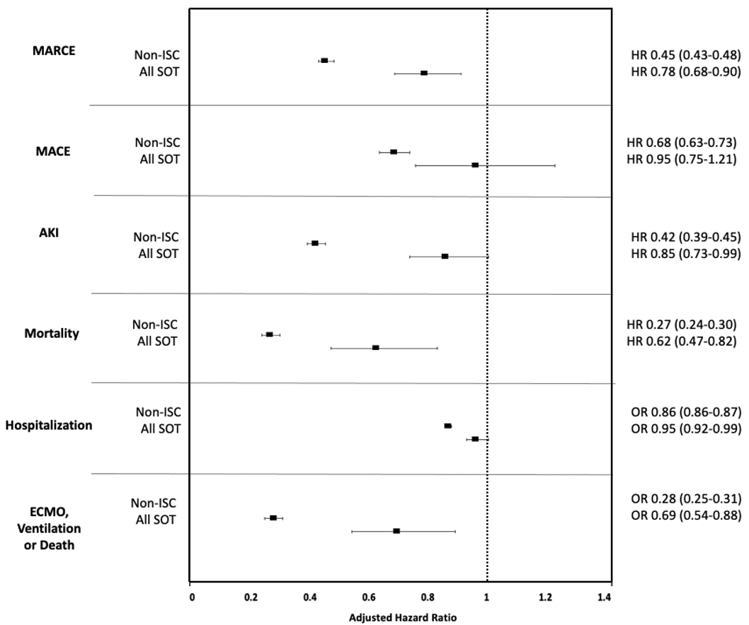 Results: Over the study period, following VAX2, BTCo occurred in 818 (11.5%) SOT recipients and 38,401 (5.7%) non-ISC patients. Median time from vaccination to BTCo was 117 days (IQR 68-145) in the SOT cohort and 127 days (IQR 93-154) in the non-ISC cohort. Lung transplant recipients had the highest cumulative incidence of BTCo, and after non-ISC, and liver transplant recipients had the lowest (Figure 1). The greatest relative benefit with vaccination for both non-ISC and SOT cohorts was in BTCo mortality (HR 0.27, 95% CI 0.24-0.30 for non-ISC and HR 0.62, 95% CI 0.47-0.82 for SOT relative to UVS), and in the composite of needing ECMO, ventilation, or dying (OR 0.28, 95% CI 0.25-0.31 for non-ISC and HR 0.69, 95% CI 0.54-0.88 for SOT relative to UVS), Figure 2.