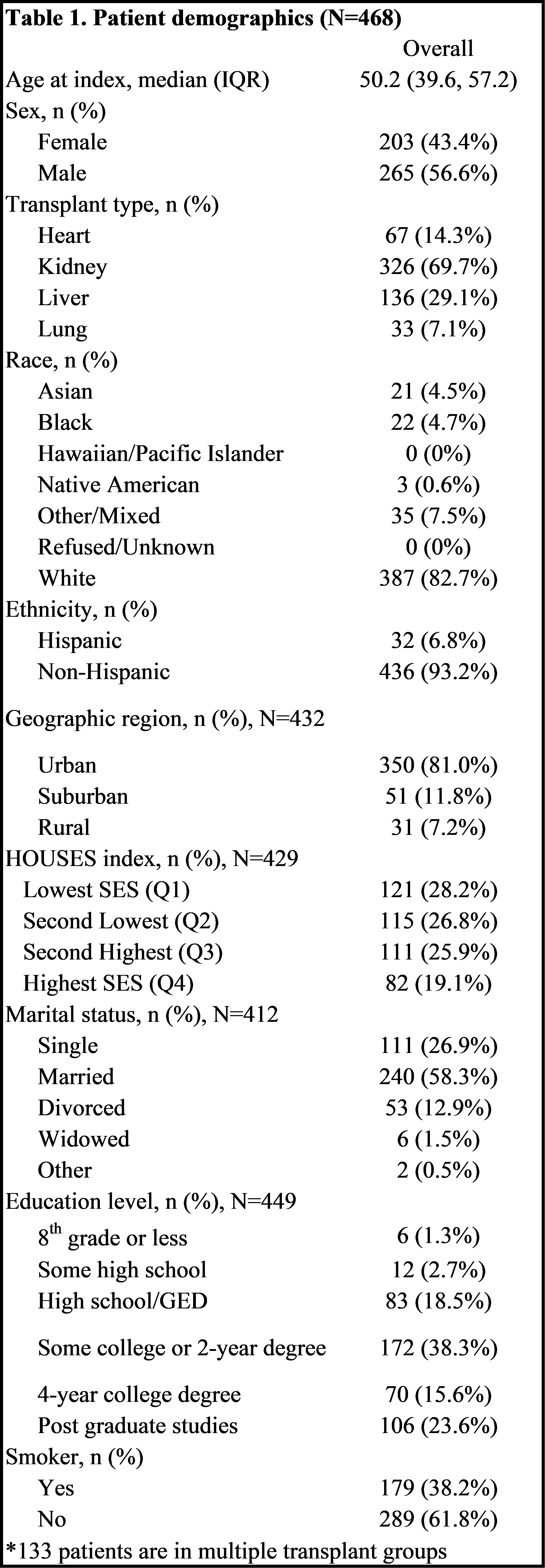 Results: 468 solid organ transplant patients were identified (Table 1). Liver and lung transplant patients were least vaccinated for influenza. Influenza vaccination ranged from 52-58% over the past 10 years which was slightly higher than national averages and adults in our area who were recommended to receive pneumococcal vaccines (35-43%). Race was not significantly associated with influenza vaccine uptake when adjusted for geographic region or SES as assessed by HOUSES. If patients were up-to-date on pneumococcal vaccine they had a 26% higher influenza vaccination rate. Heart transplants recipients were least up-to-date on pneumococcal vaccines. 56% of patients were compliant with pneumococcal vaccines, with a median of 18 months undervaccinated. Those living in urban settings were significantly better vaccinated for both influenza and pneumococcus even when adjusted for all other variables (Table 2).