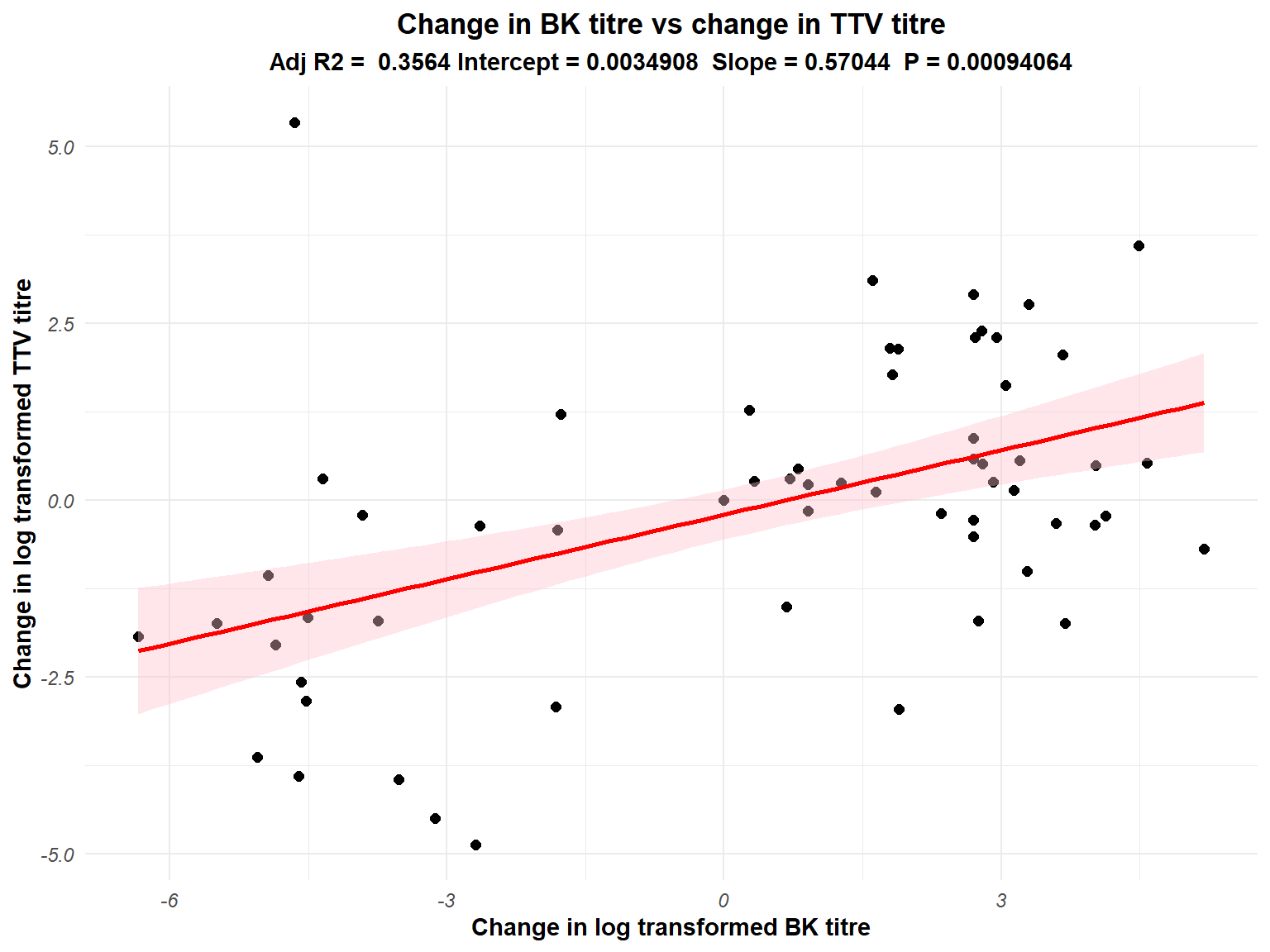 Result: The log-transformed mean TTV titre at the 4 time points were 5.02 (2.07), 5.52 (1.74), 6.23 (2.14) and 4.56 (1.27) respectively. In the multivariable model, log-transformed BK virus titre increased by 0.25 for every 1 ng/mL increase in tacrolimus concentration (p 0.0008). However, every 1 log rise in TTV titre led to 0.57 (0.17) log copies increase in BKV titre (p 0.0009), once adjusted for tacrolimus concentration. The relationship between tacrolimus and BKV became statistically insignificant when TTV titre was added as a predictor variable. This implies that TTV titre is a more sensitive predictor of BK viral load than tacrolimus concentration. Although statistically significant, all changes in antiproliferative or prednisolone dose were unable to predict linear changes in BKV titres. 5 patients who lost their graft in the mean follow up of 2.8 years had significantly low TTV titres (p< 0.05) at baseline, indicating suboptimum IS burden. In this small cohort, there was no relationship between TTV titres and rejections (n=5) or de novo DSA (n=3). An ongoing adequately powered prospective study will address these questions more decisively.
