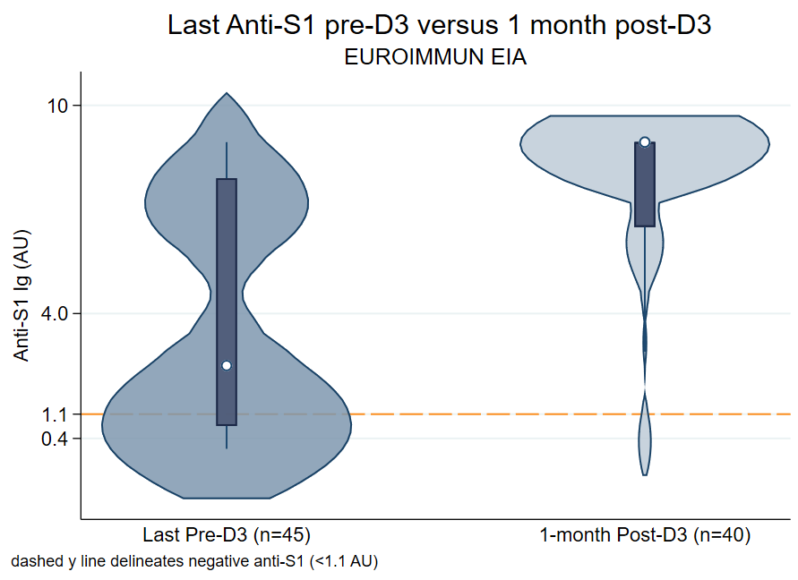 Methods: LT recipients with 3 congruent mRNA vaccines and antibody levels pre- and post-dose 3 (D3) were included. Those who reported a prior COVID-19 diagnosis or used belatacept were excluded. The latest anti-spike antibody level collected between the second (D2) and third dose (D3) was compared to the antibody level at 1 month post-D3. Samples were tested with Roche Elecsys Anti-Sars-CoV-2 enzyme immunoassay (EIA) (positive ≥0.8 U/mL) or EUROIMMUN EIA (positive ≥1.1 AU).