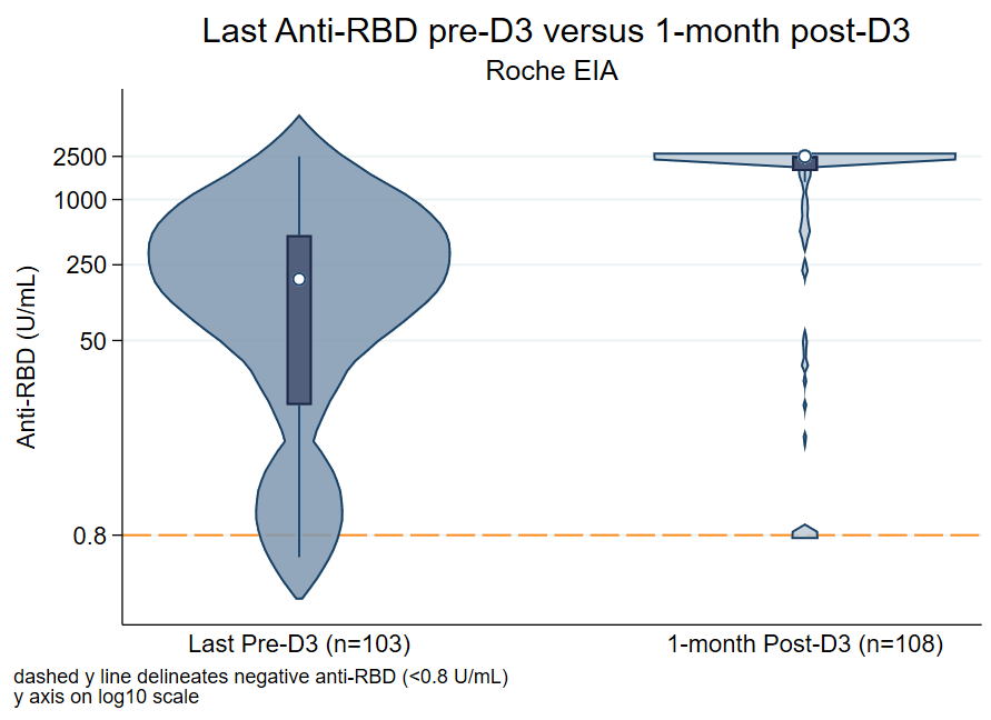 Figure: Antibody levels of latest pre-D3 versus 1 month post-D3, categorized by assay performed. The median (IQR) anti-RBD levels increased from pre to post-D3 by 12.9-fold (194 U/mL to 2500 U/mL), and median (IQR) anti-S1 levels increased by 4.5-fold (1.99 AU to 8.94 AU). The reference line delineates negative levels for anti-RBD (<0.8 U/mL) and anti-S1 (<1.1 AU) EIA.