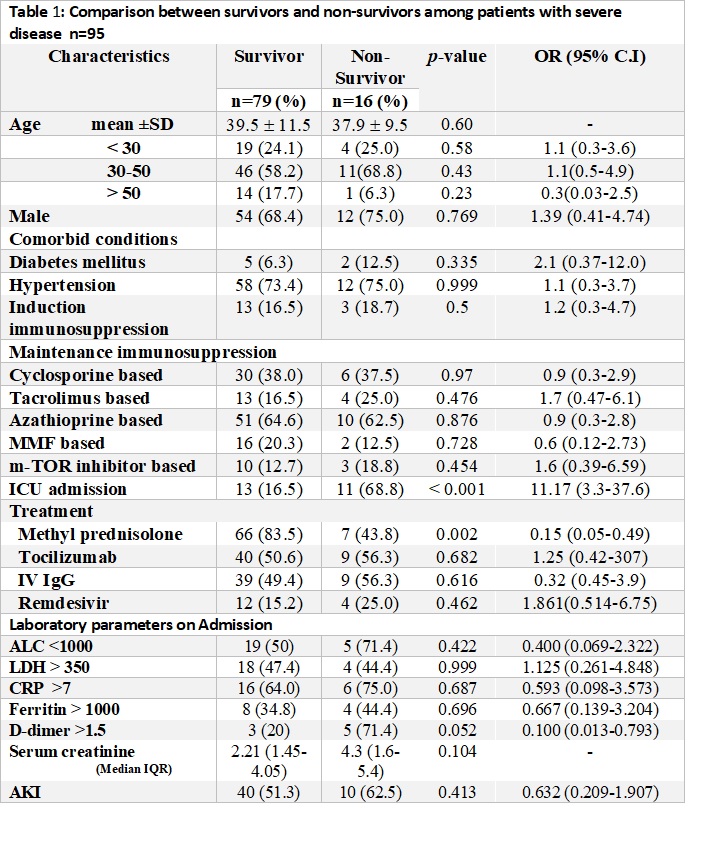 Results: A total of 95 RTRs had severe disease. There was no difference in mortality between age, gender, and co-morbid conditions among survivors and non-survivors. Both groups received a similar immunosuppressive regimen. Intensive care unit (ICU) admission [16.5% vs 68.8% p<0.001 OR 11.17 95% CI (3.3-37.6)] and high D-dimers >1.5µg/ml (p=0.052) at the time of admission were significantly associated with mortality. There was no association of graft function with mortality. Treatment with methyl-prednisolone was found to be significantly associated with survival [83% vs 43% P=0.02 OR 0.15 95% CI (0.05-0.49)]. (Table 1) WHO grading of the disease is shown in figure 1, there was a 100% mortality among patients on a mechanical ventilator.