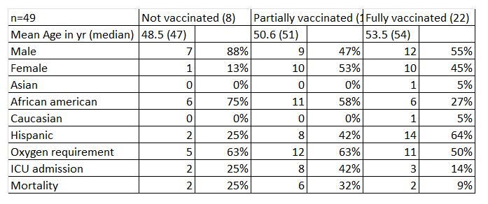 Results: There were 49 kidney and SPK recipients hospitalized with SARS-CoV 2. The majority of patients were African American and Hispanic with the mean age of 51.9 +/- 12.6 years, out of which 21(42.8%) were females. Fourteen (8.1%) patients were within one year post transplantation period. Twenty-eight (57%) patients required oxygen therapy, 13 (26.5%) patients were admitted to the intensive care unit (ICU), out of which 10 (20.4%) patients died. Twenty-two (44.9%) patients were fully vaccinated, 19 (38.7%) were partially vaccinated, and 8 (16.3%) were unvaccinated (TABLE). In the fully vaccinated group, 11(50%) patients required oxygen therapy, 3 (14%) patients admitted to the ICU and 2 (9%) died. In the partially vaccinated group,12(63%) patients required oxygen, 8 (42%) admitted to the intensive care unit and 6 (32%) died. In the unvaccinated group 5 (63%) required oxygen therapy, 2 (25%) patients were admitted to the intensive care unit and subsequently died. One fully vaccinated patient and 2 partially vaccinated patients were admitted to the ICU for hyperglycemia management rather than COVID 19 related symptoms.