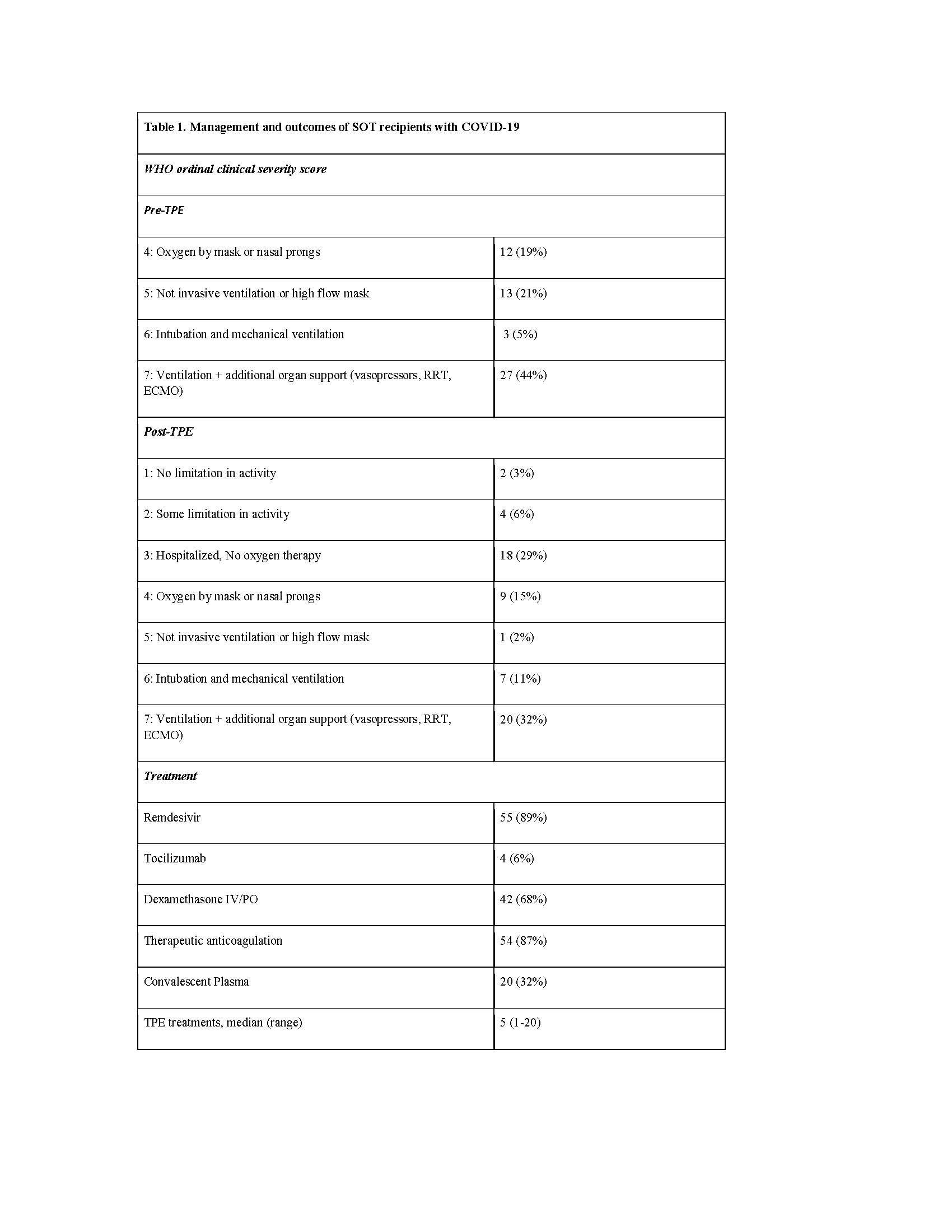 Results: 62 patients were followed for median of 141 days (range 8-376). The median age was 60 years (range 28-78), 65% were male, 76% had hypertension, 55% had diabetes and 81% were overweight with a BMI > 25 kg/m2. 90% were of Hispanics and Afro-Caribbean ethnicity. The most common transplanted organ was kidney with 54 patients (87%), followed by liver with 4 patients (6.5%). Time from transplant to diagnosis was 10 months(median, IQR 4-37) and time from symptoms to admission was 3 days (median, IQR 2-5). 79% of the patients were admitted to an intensive care unit (ICU). Tacrolimus (77%) and mycophenolate mofetil (87%) were the most common immunosuppressant drugs used with mycophenolate mofetil being held in 75% of the patients. The median of TPE sessions was 5 (range 1-20). Prior to TPE, there were 27 patients (44%) requiring ventilatory support and additional support (vasopressors, Renal Replacement Therapy (RRT) or Extracorporeal Membrane Oxygenation (ECMO)). A reduction of 32% support on the 27 patients was observed after TPE. The WHO severity score pre- and post-TPE therapy was statistically significant (p<0.001). The overall mortality was 26/62 patients (42%). Secondary infections were diagnosed in 35/62 (56%) of patients with 77 % leading to mortality and of those, 38 % were fungal infections. The median length of stay was 42 days (range 2-207). 4/54 (7%) kidney transplant recipients developed graft failure at 9, 18, 139 and 344 days respectively; and 4/54 (7%) had episodes of acute rejections at 1,14, 22 and 124 days of COVID diagnosis, respectively. Univariable analysis showed that older age and elevated LDH pre TPE and the lack of decline on LDH, D Dimer, CRP and ferritin values post TPE were risk factors for mortality ( p=0.001; 0.022; 0.006; 0.004; 0.0002 and 0.043, respectively). The presence of a secondary infection was correlated with increased likelihood of death from 25% to 55% and it occurred with a mean of 8 days (range 1-65) from its diagnosis. Multivariate analysis showed older age and CRP values post TPE as risk factors for mortality (p=0.015 and 0.04, respectively).