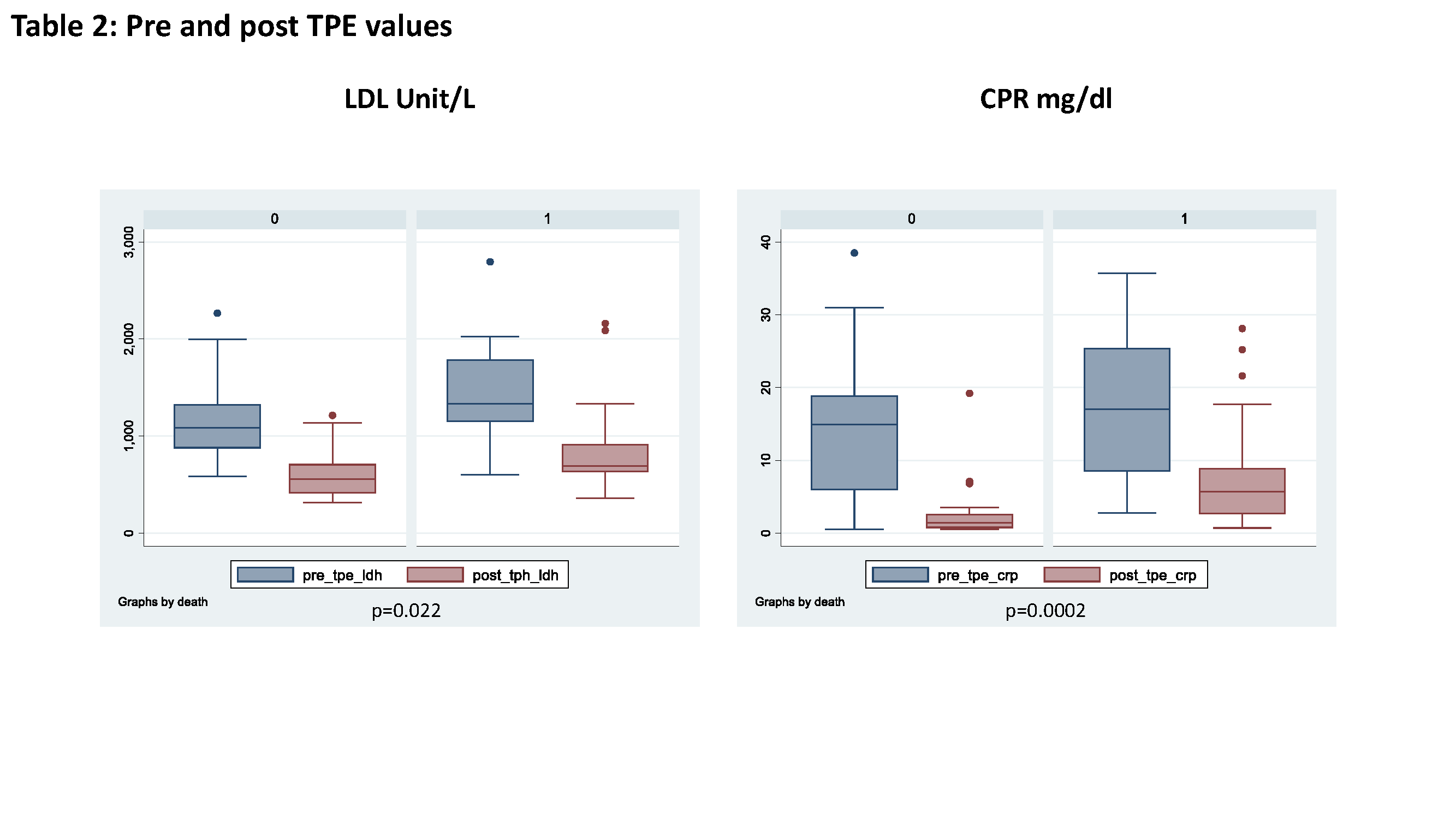 Conclusion: SARS-CoV-2 infection with cytokine storm leading to ARDS leads to high mortality, especially in the SOTr. TPE appears to be a valuable tool to control the cytokine storm by reducing the systemic inflammatory response and improving the overall critical state. Alongside with older age, we observed that high levels of LDH pre TPE and the persistent high levels of the other inflammatory parameters, specifically CRP post TPE and secondary infections, were predictors of mortality. Further research is needed to establish if these findings can lead to clinical guidelines.