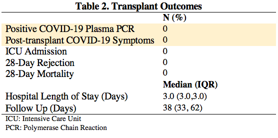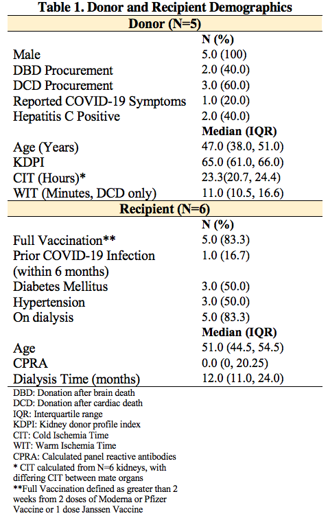 Results: Six recipients underwent kidney transplantation from COVID-19+ donors. One donor had reported mild symptoms of COVID-19 prior to hospitalization. Two donors tested Hepatitis C positive by nucleic amplification testing. 83.3% (N=5) of recipients were fully vaccinated prior to transplant (Table 1). An additional recipient had not been vaccinated but had history of recent COVID-19 infection. None of the recipients developed COVID-19 symptoms post-transplant. All had undetectable serum plasma COVID-19 PCR prior to discharge (testing range post-operative day 2 to 5). Post-transplant median length of stay was 3 days. Median follow-up was 39 days (33, 62). Two recipients had delayed renal allograft function. One patient developed antibody-mediated rejection diagnosed on post-operative day 30. No recipients required post-transplant testing for suspected COVID-19 symptoms. There was no mortality (Table 2).