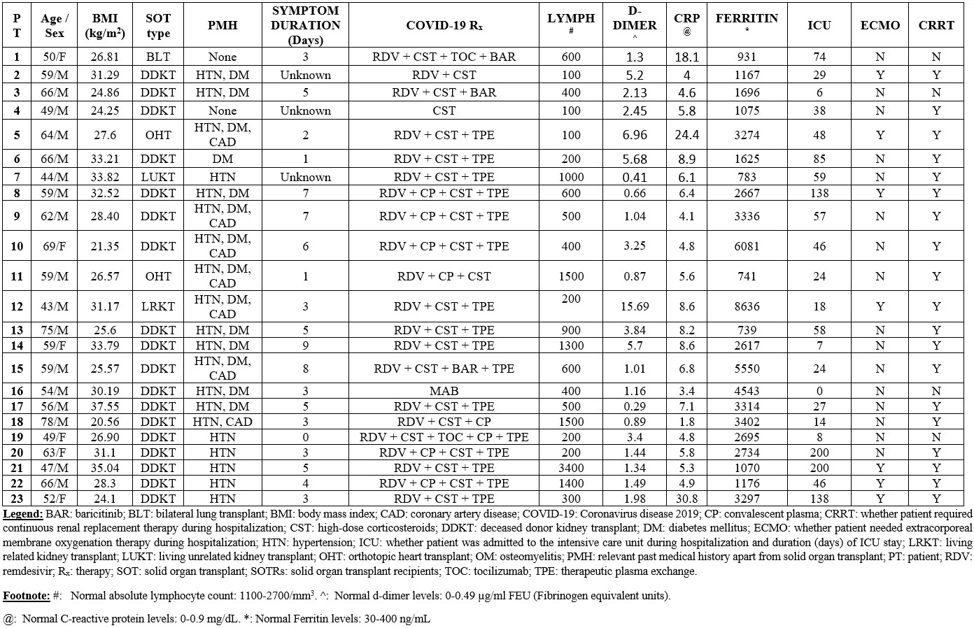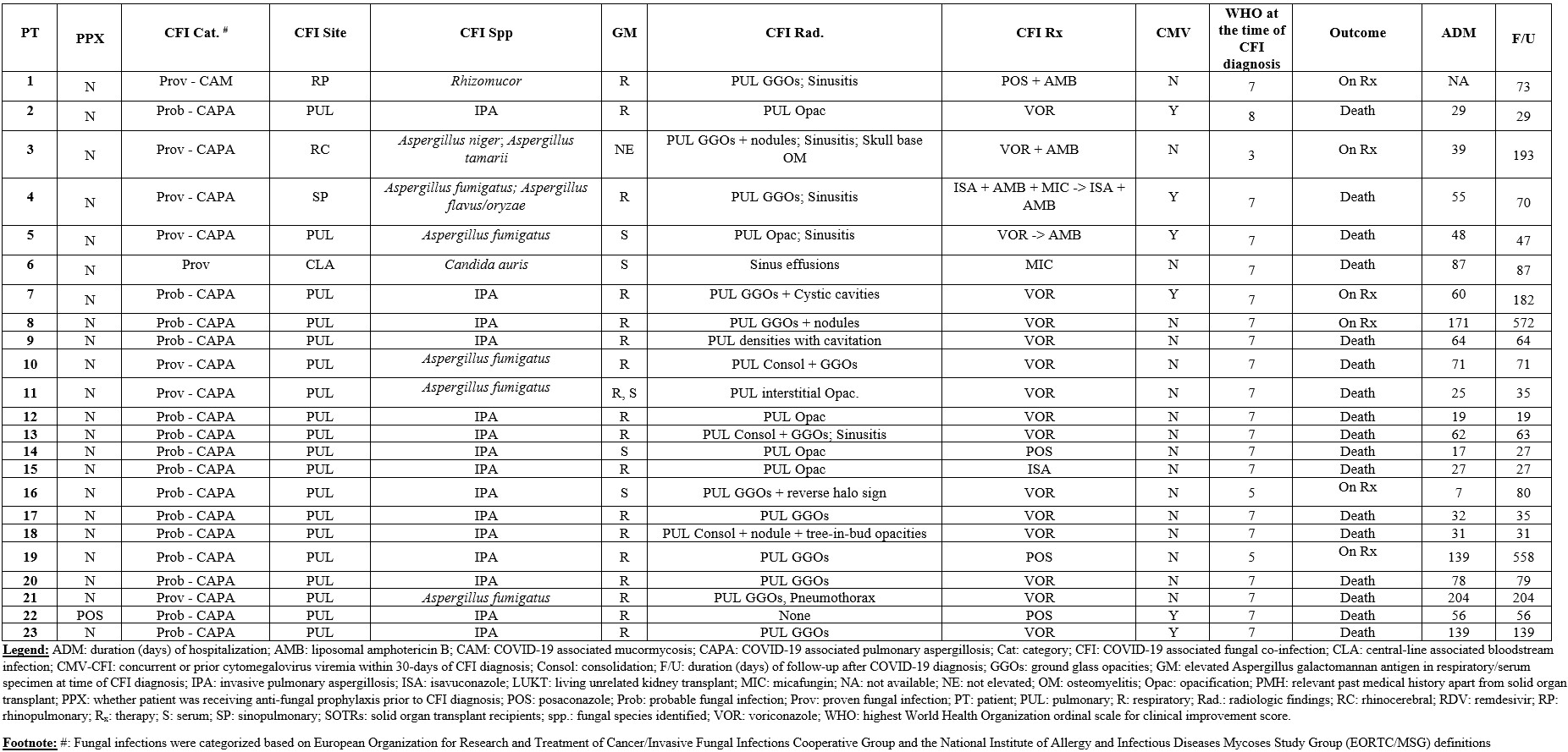Methods: This was a single center retrospective study at a large volume transplant center in South Florida, USA. We included adult SOTRs (≥18 years) diagnosed with COVID-19 between March 1st 2020 and January 31st 2022, with a subsequent diagnosis of CFI. We collected information related to demographics, comorbidities, COVID-19 diagnosis and therapeutics, and CFI diagnostics and management. We performed descriptive statistical analysis on the data obtained.