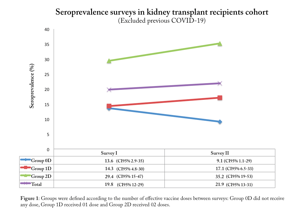 Methods: This study is a prospective cohort of outpatient KTR based on four consecutive serological surveys plus clinical and epidemiological questionnaires. We present here the preliminary results from two completed surveys (performed from April to June-2021 and from Aug to Sept-2021, respectively). Presence of antibodies against SARS-CoV-2 was assessed using an electro-chemiluminescence immunoassay for qualitative detection of antibodies to SARS-CoV-2 nucleocapsid, the Elecsys Anti-SARS-CoV-2 from Roche (cut off index ≥ 1.0 = reactive, sensitivity of 99.5% and specificity of 99.8%). We considered effective vaccine doses if they have been administered at least 14 days before blood sample collection. We characterized three groups according to the number of effective vaccine doses administered between the first and second surveys: Group 0D, those who did not receive any dose; Group 1D, those who received 01 dose and Group 2D, those who received 02 dose between surveys.